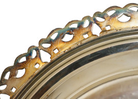 Piatto tondo in argento con bordo decorato a volute a traforate, gr. 356, diam. cm 24, (difetti)