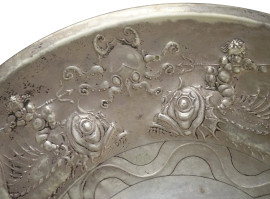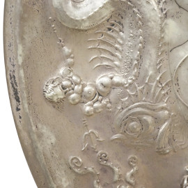 Piatto tondo in metallo argentato decorato a sbalzo con mostri marini e putti con tridente, XX secolo, diametro cm 46 (difetti)