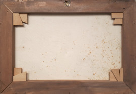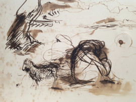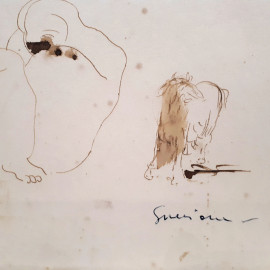 Piero Guccione (1935-2018) Composizione con figure sedute e capre, 1961, inchiostro bruno su carta applicata su tela, cm 33x47, firmato titolato e datato