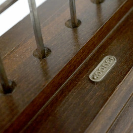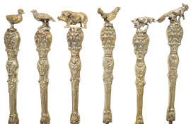 Porta spiedini in legno contenente 23 spiedini in metallo con terminali a foggia di animali, Gucci, XX secolo, cm 42x47,5x12 (difetti e mancanze)