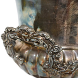Portachampagne in metallo argentato a foggia di coppa con manici a volute vegetali, XX secolo, altezza cm 30