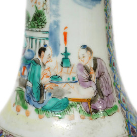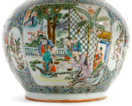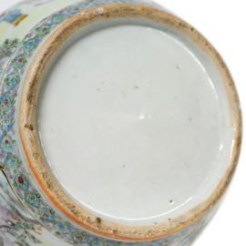Potiche in ceramica policroma con decori vegetali e personaggi, Cina, XX secolo, altezza cm 46, (difetti)