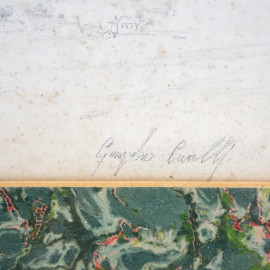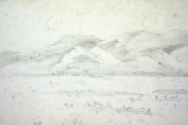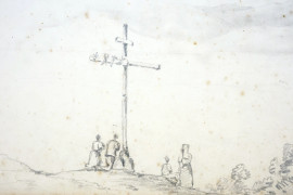 Preghiera presso un crocifisso di montagna, matita su carta, firmato in basso a destra, cm 65x34 , entro cornice