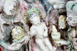 Presepe in maiolica vietrese policroma, cm 40,5x30,5, entro cornice, (difetti)