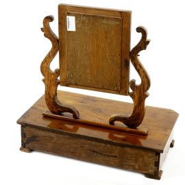 Psiche da comò in noce con cassetto frontale e specchio affiancato da sostegni a volute, inizio sec. XX, cm 62x34x59, (difetti)