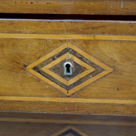 Ribalta in noce con intarsi geometrici romboidali in bosso, a tre cassetti e sportello a ribalta, sec. XVIII-XIX, cm 113,5x66x39,5, (difetti)