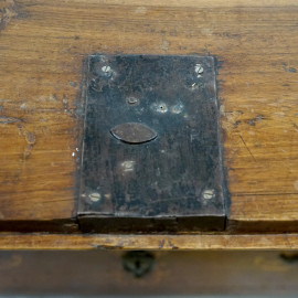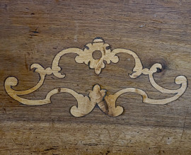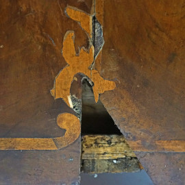 Ribalta in noce con intarsi in varie essenze, tre cassetti con inserti bronzei a moti vegetali, ribalta contenente quattro cassetti e vano centrale a doppio ripiano, XVIII secolo, cm 94,5x52,5x120 (difetti)