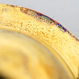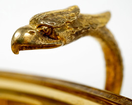 Salsiera in argento vermeil con bordo cesellato e presa a foggia di testa d'aquila, peso gr. 290, cm 9,5x18x14,5