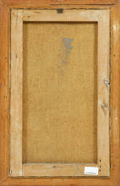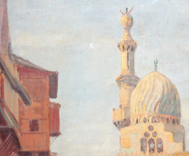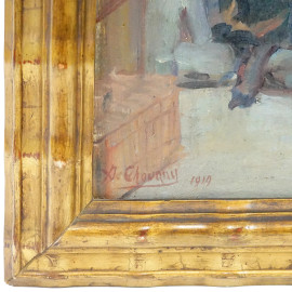 Scorcio urbano con figure, olio su tela, firmato e datato in basso a sinistra A. 1919, cm 71,2x42,2, entro cornice