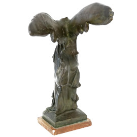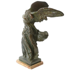 Scultura in bronzo rappresentante la Nike di Samotracia, base in marmo, XX secolo, altezza cm 39,5