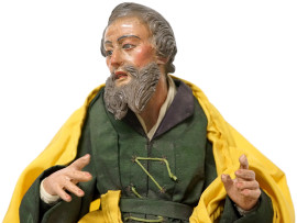 Scultura in terracotta dipinta e stoffa con occhi in vetro rappresentante San Giuseppe, XX secolo, altezza cm 37 (difetti)