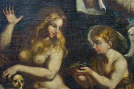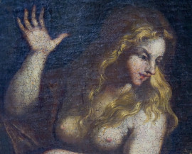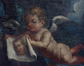 Scuola italiana del XVII secolo, Maria Maddalena riceve i simboli della Passione, olio su tela, cm 44,5x33,5, entro cornice, (difetti)