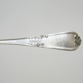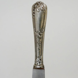 Servizio di posate in argento composto da 12 coltelli grandi, 12 coltelli piccoli, 12 forchettine, 12 forchette, 11 cucchiai e 12 cucchiaini, sec. XX, gr. 1.828