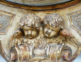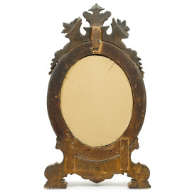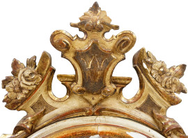 Specchiera da comò in legno intagliato, laccato e dorato, di forma ovale, con cornice a volute e a motivi vegetali e floreali, due cherubini al centro della base, XIX secolo, ingombro cm 105x61 (difetti)