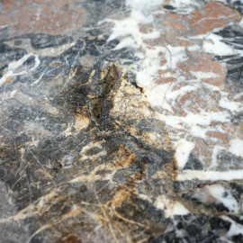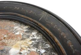 Tavolinetto tondo in legno ebanizzato con piano in marmo, decori incisi e traforati, fusto tornito poggiante su tre piedi mossi, fine XIX secolo, diametro cm 48.5, altezza cm 78 (difetti e segni del tempo)