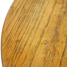 Tavolino con piano circolare in rovere, fusto tornito poggiante su quattro piedi, XX secolo, altezza cm 74, diametro cm 75,5