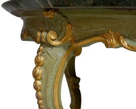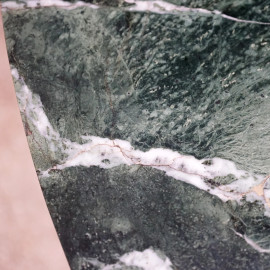 Tavolo circolare in legno laccato verde con finiture dorate e piano circolare in marmo verde Alpi, poggiante su quattro gambe mosse con piede leonino, sec. XX , alt. cm 79 , diam. cm 159. (Difetti)