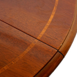Tavolo ovale in mogano e piuma, con quattro prolunghe, intarsi in varie essenze, poggiante su quattro gambe scolpite, XIX secolo, cm 78x120x9 circa