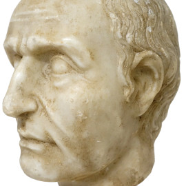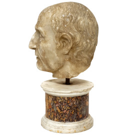 Testa di Giulio Cesare in marmo bianco su base cilindrica in marmo, XIX-XX secolo, cm 37x16x20. (Difetti)