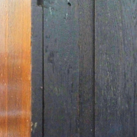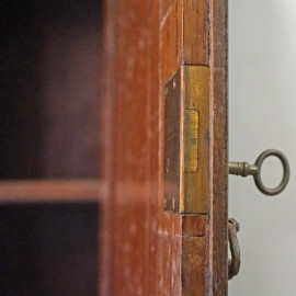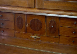 Trumeau in rovere con corpo superiore a due sportelli e interno a tre cassetti, due ripiani e un terzo minore mistilineo e intagliato; corpo inferiore a quattro cassetti e ribalta contenente nove cassetti e un vano centrale a sportello, XVIII-XIX secolo, cm 200x112x57,5 (difetti)