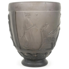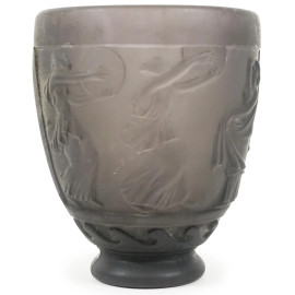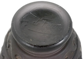 Vaso Art Decò in vetro satinato nei toni del viola, con decori classici, firmato sotto la base G. de Feure, Francia, sec. XX, altezza cm 14