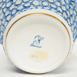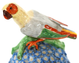 Vaso in porcellana smaltata policroma, decorato con fiori a rilievo e sormontato da un uccellino, su piedistallo con piedini a voluta, marchio sotto "Dresden", altezza cm 33,5