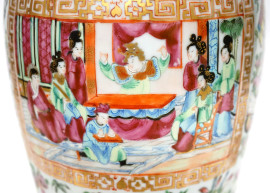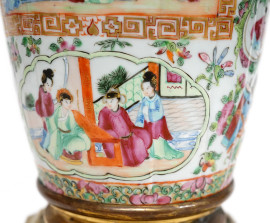 Vaso orientale montato a lampada in porcellana decorata in vivace policromia con scene di genere racchiuse entro riserve, base in bronzo dorato, sec. XIX-XX, cm 17x54, (difetti)