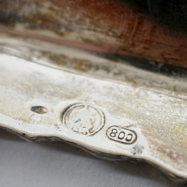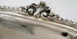 Vassoio ottagonale polilobato con decorazione a cesello lungo il bordo terminate in riccioli al centro dei lati maggiori, XX secolo, peso gr. 850, cm 35x33,5