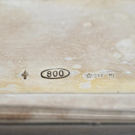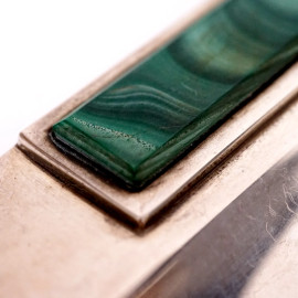 Vassoio rettangolare in argento con inserti in malachite, XX secolo, peso gr. 644, cm 20,5x30 (difetti)