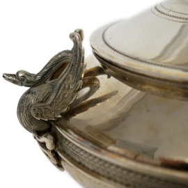 Zuccheriera in argento cesellato con anse decorate a foggia di cigni e coperchio con presa a pigna, peso gr. 500, altezza cm 18