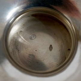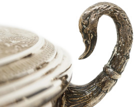 Zuppiera in argento e argento vermeille con rifiniture sbalzate e cesellate, corpo e coperchio decorato a fregio continuo a festoni e motivi vegetali, anse a foggia di collo di cigno, XX secolo, peso gr. 1030, altezza cm 20