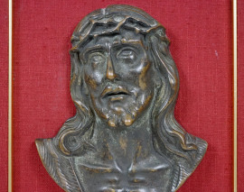 Altorilievo in bronzo raffigurante Cristo coronato di spine, XX secolo, diametro cm 19,5x16, entro cornice
