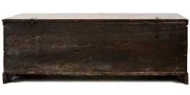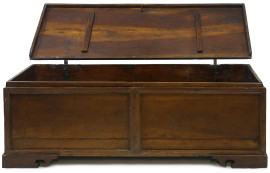 Antica cassapanca in noce, XVIII secolo, fronte pannellato, piedi a mensola, cm h 53x154,5x48,5, (difetti, parti sostituite)