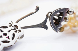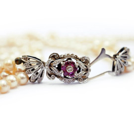 Collana a tre fili di perle con chiusura in oro bianco 18 kt impreziosita da rubini e brillantino, lunghezza cm 36