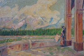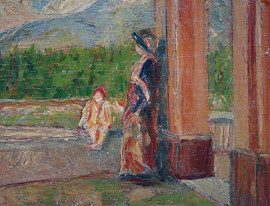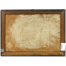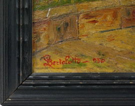 Esterno di villa con figure, olio su tavoletta, cm 28,5x41,5, firmato, entro cornice.