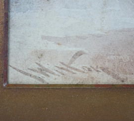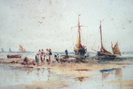I. Wilton, Paesaggio con pescatori, acquarello su carta, cm 21,5x40, entro cornice, (difetti)