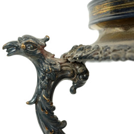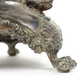Lampada da tavolo in metallo argentato lavorato, poggiante su tre piedi a zampa di leone, XIX secolo, altezza cm 58