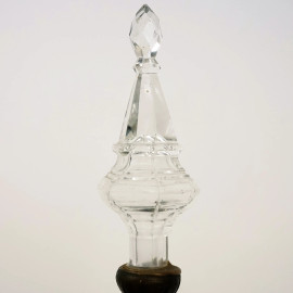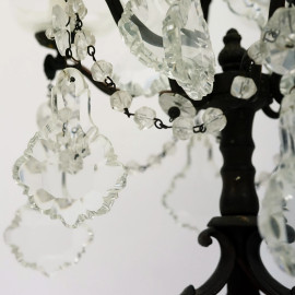 Lampada da tavolo in metallo brunito e pendenti in cristallo, XX secolo, cm h 61,5, (difetti)