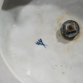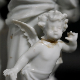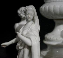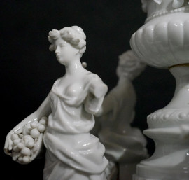 Lampada da tavolo in porcellana bianca, Germania, Volkstedt Rudolstadt, XIX secolo, decorata da cinque figure femminili e putti danzanti, cm h 28,5, (difetti)