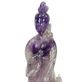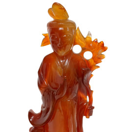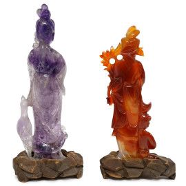 Lotto di due sculture raffiguranti Guanyn, in agata corniola e ametista, basi in legno, h max cm 24, (difetti)