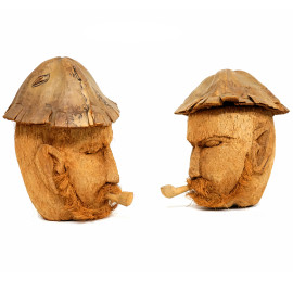 Lotto di due teste in cocco raffiguranti uomini che fumano la pipa, anni '70, altezza cm 20