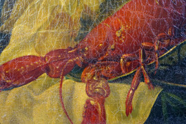Natura morta con aragosta, stampa applicata su tavola, cm 23,8x33,5, XX secolo, entro cornice