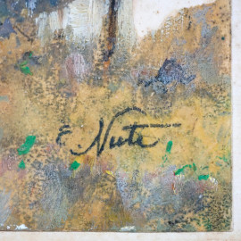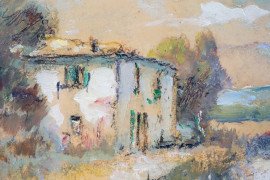 Paesaggio con casolare, olio su cartoncino, cm 14x20, entro cornice