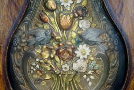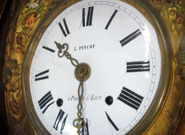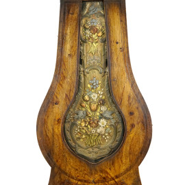 Orologio a pendolo, Francia, seconda metà del XIX secolo, cassa in legno, quadrante in metallo sbalzato e dorato con decorazioni policrome a motivi floreali. Reca iscritto sul quadrante "L. Pincot / à Pouilly -s/Loire", cm h 238x55x22, (difetti, da revisionare)