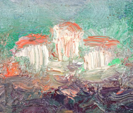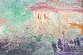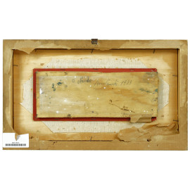 Paesaggio con case, olio su compensato, iscrizione sul retro, cm 10,3x26,8 circa, entro cornice