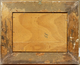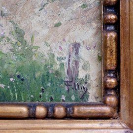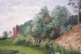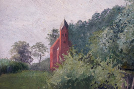 Paesaggio con chiesa, olio su tavola, cm 24x24, firmato Follini, entro cornice.