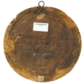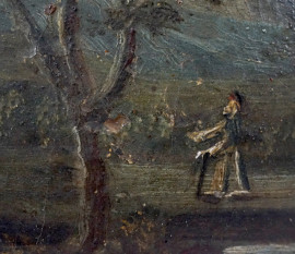 Paesaggio con viandante, olio su tavola convessa con cornice scolpita, XVIII-XIX secolo, diametro cm 30, (difetti)