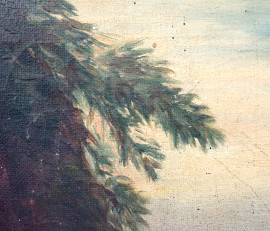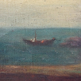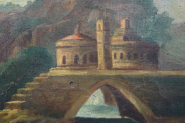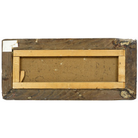 Paesaggio costiero con capriccio architettonico, olio su tela, XX secolo, cm 17,3x49,5, entro cornice