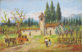 Paesaggio di campagna, olio su tavoletta, XX secolo, cm 5,5x8,9, entro cornice