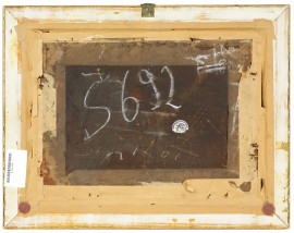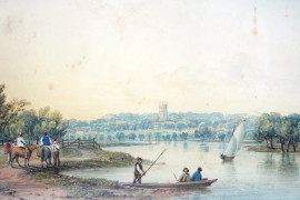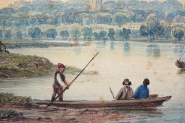 Paesaggio fluviale con figure e imbarcazioni, acquerello su carta, fine XIX secolo, cm 19x29, entro cornice